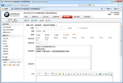 北京荣京宝马销售公司,是一家北京比较早期的宝马汽车4S店。得益于宝马品牌的指导,公司在多年的经营中建立起非常完善的管理体系。